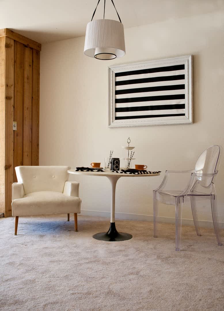 Establish a unified color scheme throughout your entire home. Chances are you have a favorite color that appears throughout your home. Work with this, rather than against it, by choosing the most prominent color in your home, then create a sophisticated color palette around this color. In this condo, the vibrant orange was already in place. We chose complementary colors to enhance the shade and bring it from dated to modern. Once you’ve established a small color palette (2 – 3 colors), stick with it and try to use these colors predominantly throughout each room. When it comes to patterns, pick just one. Keep in mind that the main goal is to create a cohesive look and soothing energy throughout the home, so introduce one pattern that coordinates with your chosen color scheme, then try repeating this pattern on pillows in the living room, placemats in the dining room, shower curtain in the bathroom, etc.