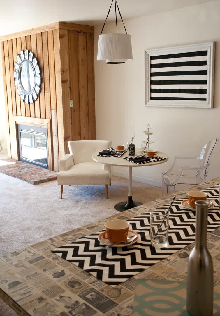Rethink how you use the objects you already own. Create a fresh feel by simply moving furniture around and finding new ways to use pieces. We took the dresser from the guest room and turned it into a bar top in the living room. Since this is for staging, the pieces don’t have to entirely fit the bill, as long as they are hinting at the idea for the buyers to recreate. While they may not opt to have a bar in their new home, it shows that the space can be utilized as it’s own area – possibly a small desk, bookshelf, or reading zone. We also removed a second bunk bed from the guest room and used the lower half of it to create a daybed/lounge in the living room. This allowed for additional seating without blocking the views. Look at the pieces in your home with a new eye; swap out your nightstands for the end tables in your living room, move a lamp to a different room, or if the space can survive without it, remove it!