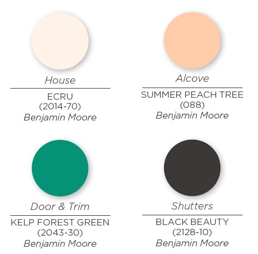 PAINT COLORS A vibrant blue-green front door brings life to this neutral home. Black shutters keep the overall effect grounded, while the peach alcove offers a cheery dose of unexpected color. Exterior pants by Benjamin Moore.