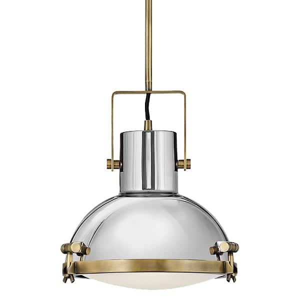 Nautical Nod Heritage brass boldly plays with polished nickel in this industrial-meets-coastal pendant. The confident structure of the piece is counterbalanced by its soft, domed, etched opal glass shade. Nautique Pendant by Hinkley, $575, lumens.com