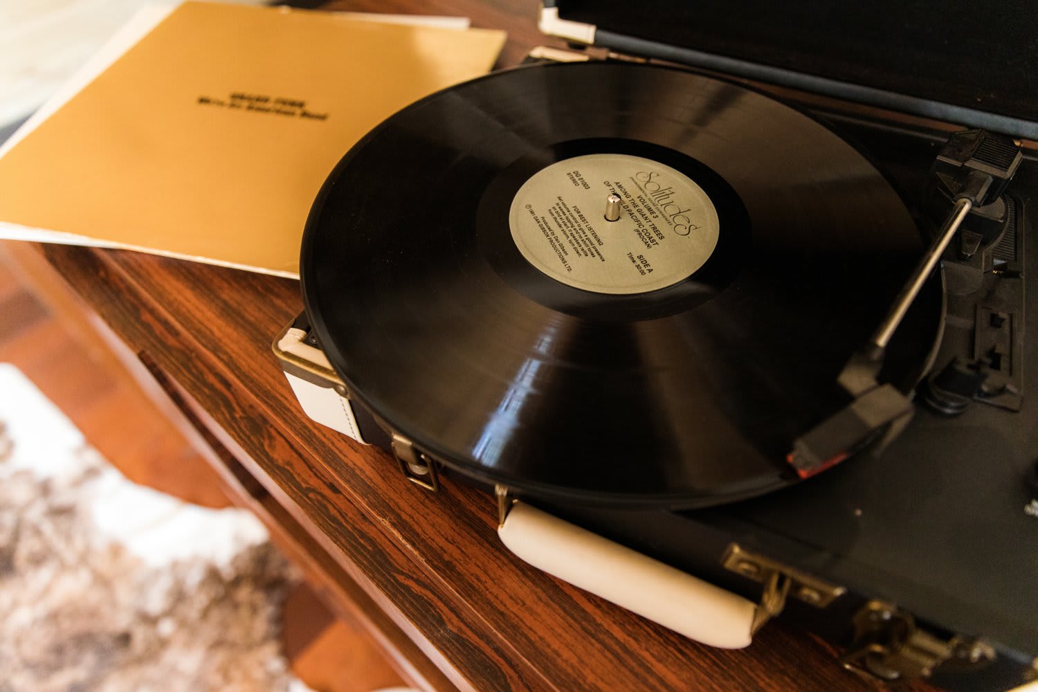 Tucked beneath the spiral staircase, a mid-century modern tiger wood dresser houses the record player and vinyl collection. The vintage gold-coated hand chair serves as an art installation.
