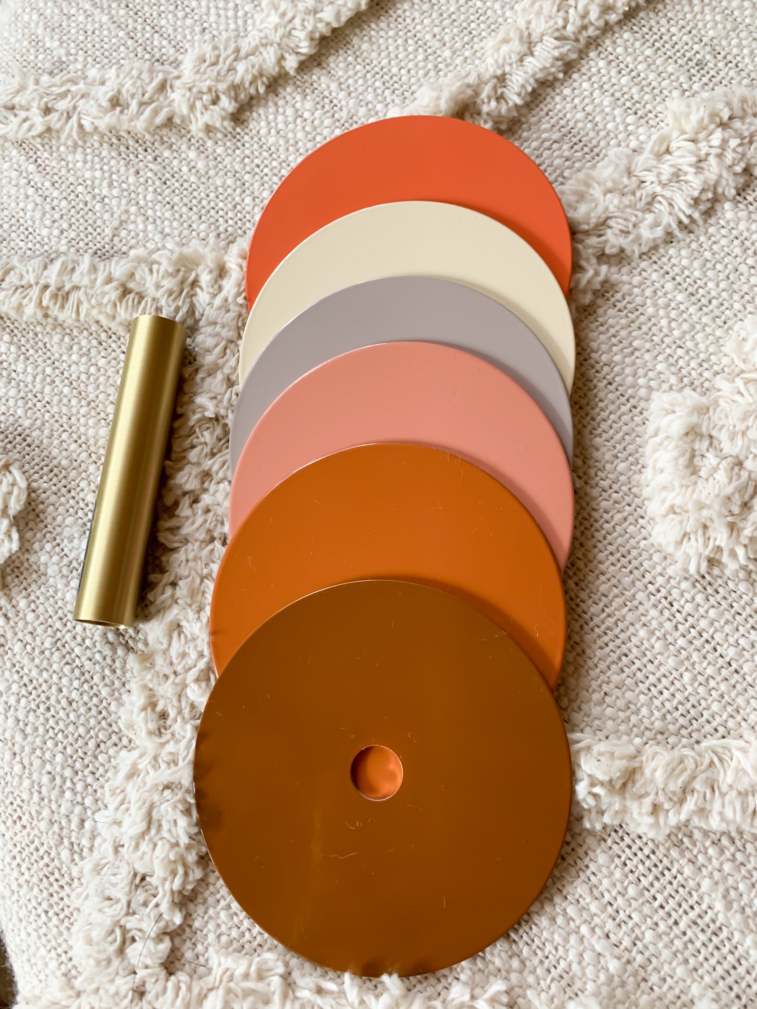 The owner/designer chose a retro sunset-inspired palette in six shades for the globe finials, paired with six-inch milk-glass bulbs, and champagne bronze hardware.
